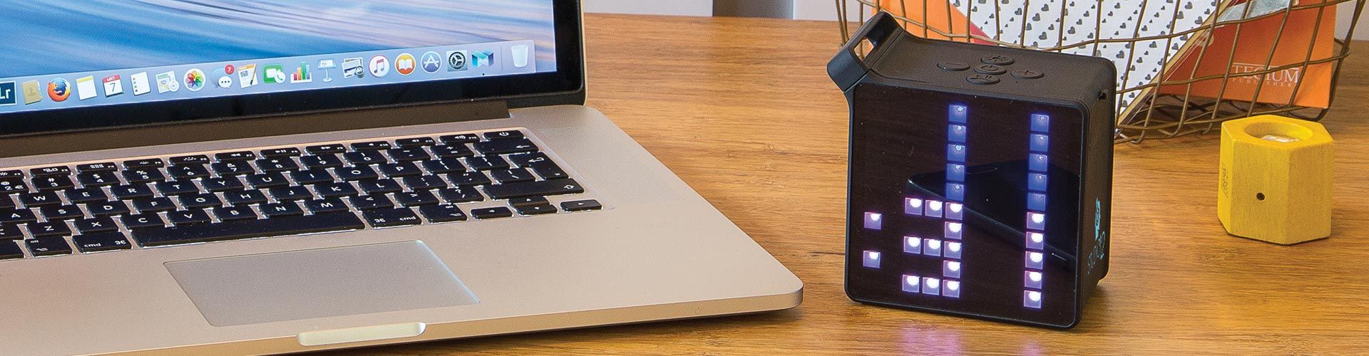A powerful retro-styled black wireless speaker with a customisable 100 LED screen via the free App.