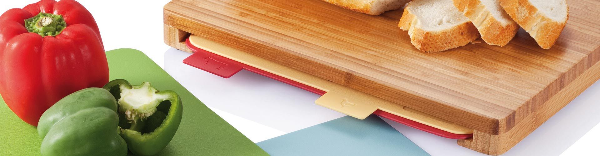 Dark bamboo cutting board 35x25cm, also functions as storage case for 4 hygienic PP cutting boards. Colour and icon indicate the type of food use for each board.