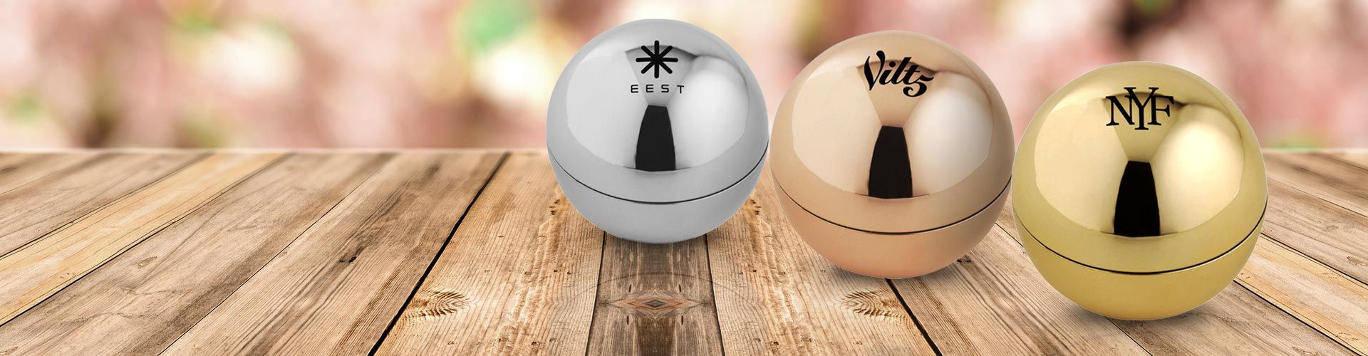 A neutral colour, vanilla-flavoured lip balm encased in a metallic finish spherical case with twist off lid.