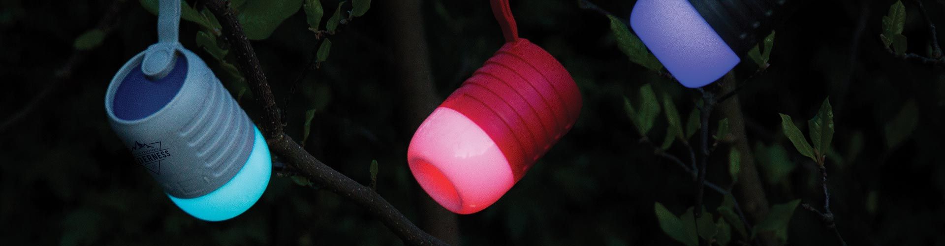 A powerful 3W wireless outdoor speaker with silicon hanging strap and colour changing lamp.